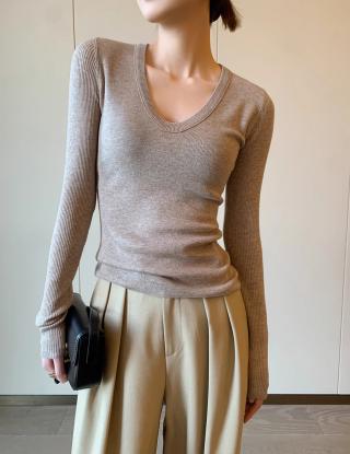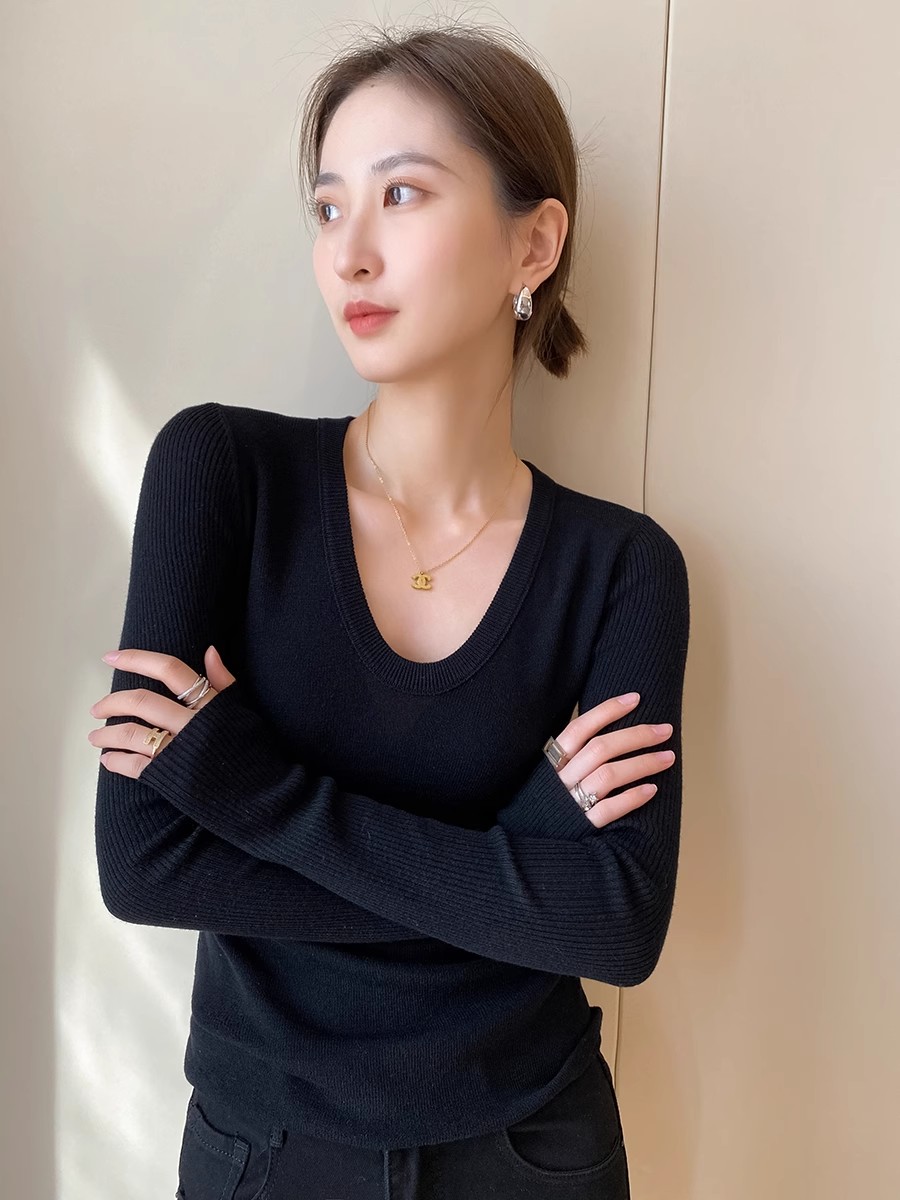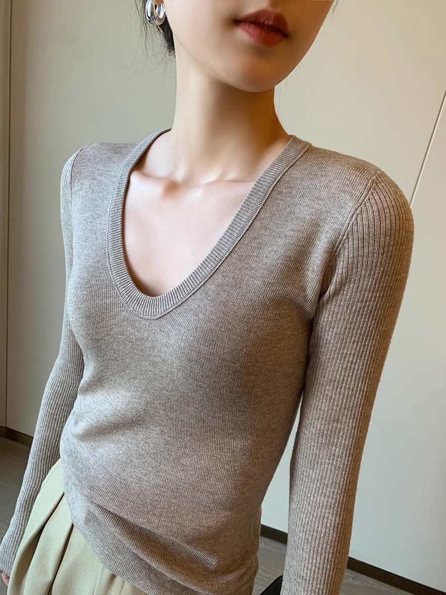 灰色U领针织衫女秋季2024新款修身显瘦内搭打底衫紧身毛衣